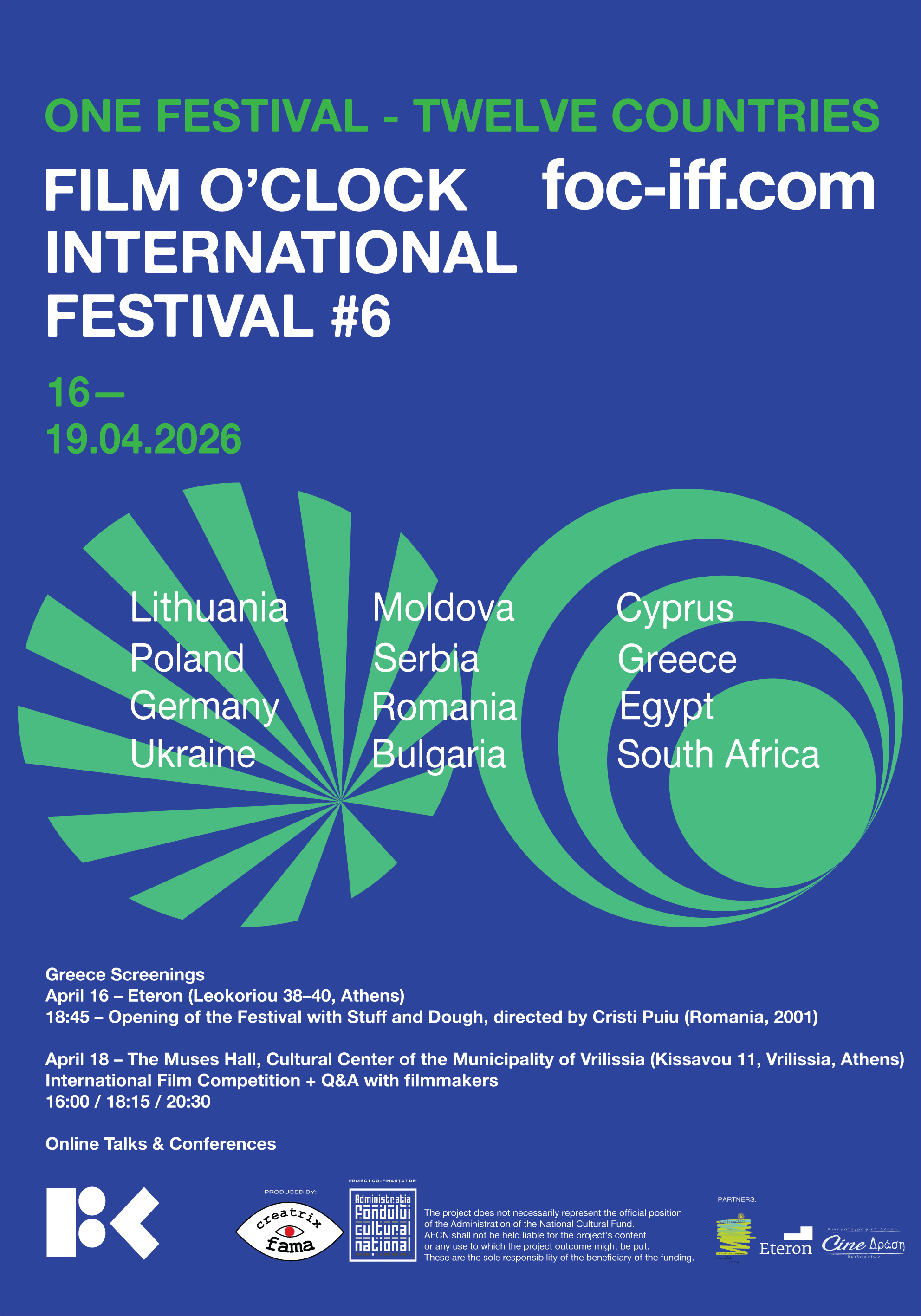 Φέτος η έναρξη του φεστιβάλ θα γίνει στην Αθήνα, την Πέμπτη 16 Απριλίου στις 18:45 στο Eteron – Institute for Research and Social Change (Λεωκορίου 38-40, Αθήνα, 10553) με την προβολή της ταινίας “Stuff and Dough (Marfa și banii)” του διακεκριμένου ρουμάνου σκηνοθέτη Cristi Puiu.